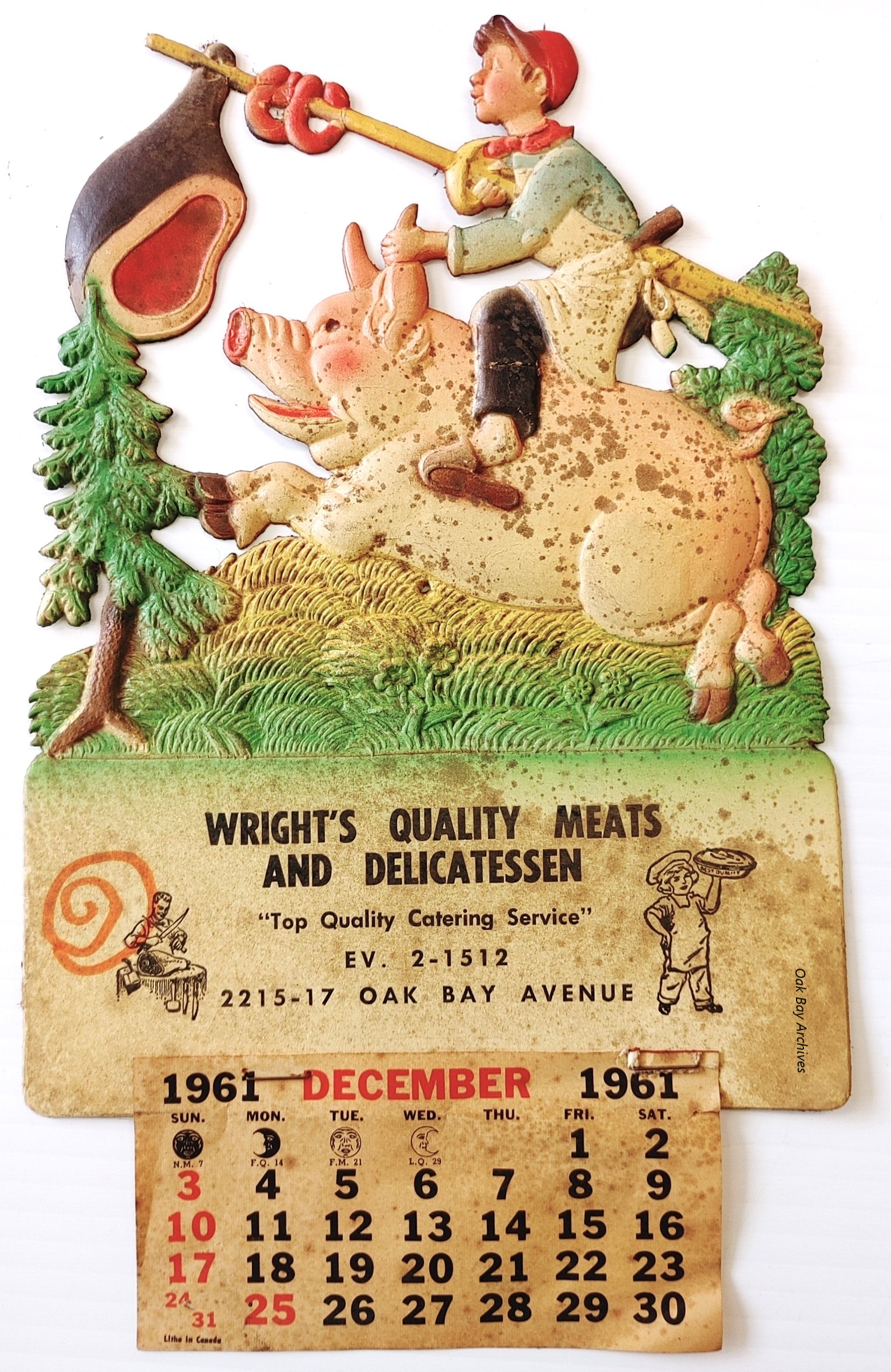Day 14 The advertising ephemera category is usually a good source of #UnusualArchives; today's is a fun example, an embossed cutout card with paper calendar from 1961, advertising Wright's Quality Meats & Delicatessen at 2215-17 Oak Bay Avenue, in the Bell Block. The illustration shows a boy wearing a red cap and neckerchief, butcher's apron, and slippers, riding a large pink pig through a wooded landscape. The boy is holding on to the pig by one of its ears, and under his arm is a long pole with a large ham and two sausage rings hanging from it, dangling above and in front of the pig. Wright's itself was far from #Unusual, occupying a longstanding location for a succession of butcher and grocery stores in Oak Bay Village from the building of the Bell Block in 1913 until 1971.(source)