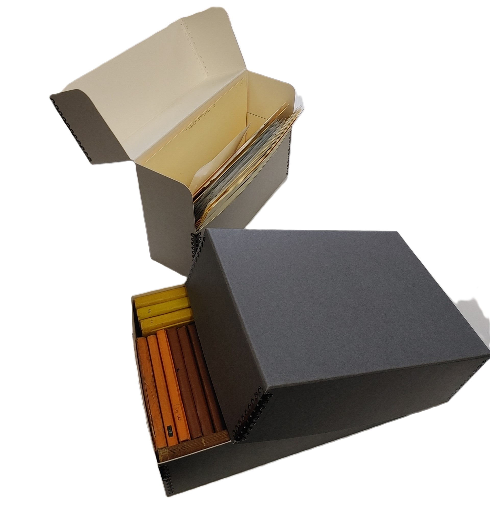 Since the majority of organizational (and indeed personal) archival records are on more or less standard letter/A4 or legal/foolscap paper, the standard boxes are too. There are also many pre-made box sizes to fit particular sizes and formats of records, and custom possibilities for unusually shaped and over sized items. Pictured above, vertical and horizontal Hollinger boxes. These are the most commonly used for standard sized paper records.