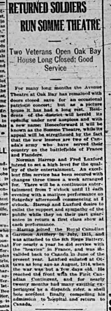 A new chapter: The theatre was still new at the outbreak of WW1, and wartime proved a difficult period to run a silent film theatre, particularly outside of downtown, though plays, musicals, and stage comedy seem to have thrived at this time. After a hiatus, it reopened in December 1917: "For many long months the Avenue Theatre at Oak Bay has remained with doors closed save for an occasional patriotic concert; but as a picture house it has had a long rest. Residents of the district will herald its opening under new auspices and with a new name. Henceforward it will be known as the Somme Theatre, while its appeal will be strengthened by the fact that the new lessees are two of Canada's army who have served their country on the battlefields of France and Flanders.