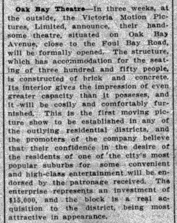"In three weeks, at the outside, the Victoria Motion Pictures, Limited, announce their handsome theatre, situated on Oak Bay Avenue, close to the Foul Bay Road, will be formally opened. The structure, which has accommodation for the seating of three hundred and fifty people, is constructed of brick and concrete. Its interior gives the impression of even greater capacity than it possesses, and it will be cosily and comfortably furnished. This is the first moving picture show to be established in any of the outlying residential districts, and the promoters of the company believe that their confidence in the desire of the residents of one of the city's most popular suburbs for some convenient and high-class entertainment will be endorsed by the patronage received. The enterprise represents an investment of $15,000, and the block is a real acquisition to the district, being most attractive in appearance. "